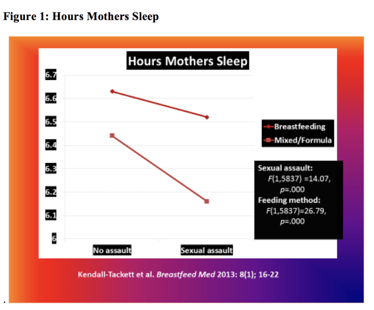 Kendall-Tackett, K. A., Cong, Z., & Hale, T. W. (2013). Depression, sleep quality, and maternal well-being in postpartum women with a history of sexual assault: A comparison of breastfeeding, mixed-feeding, and formula-feeding mothers Breastfeeding Medicine, 8(1), 16–22. doi:10.1089/bfm.2012.0024