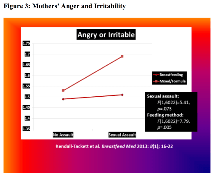 The finding on anger and irritability was also interesting (see Figure 3). The exclusively breastfeeding mothers had low levels of anger and irritability. This was not true for mixed- or formula-feeding mothers. The high level of anger and irritability in the mixed- and formula-feeding mothers is consistent with findings in trauma survivors, in general, who often have hair-trigger tempers that can suddenly flare (Ruglass & Kendall-Tackett, 2015). These findings are also consistent with those of Strathearn et al., (2009), who found that mothers who breastfed for at least 4 months were 2.6 times less likely to physically abuse their children and 3.8 times less likely to neglect them.